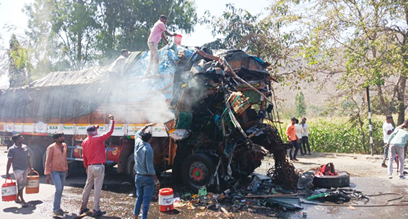 या अपघातात ट्रकच्या केबिनचा पुढील भाग पूर्णपणे दाबला जाऊन चक्काचूर झाला. त्यामध्ये ट्रक चालक अडकून पडल्याने त्याच्या दोन्ही पायांना गंभीर दुखापत झाली तसेच हात-पायाला जबर जघमा झाल्या. त्यातच काही क्षणातच अपघातानंतर शॉर्टसर्किट झाल्याने ट्रकला आग लागली आणि क्षणातच आगीने रौद्ररूप धारण केले.