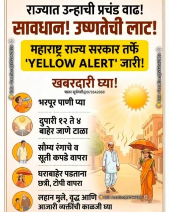 वाढत्या उन्हाच्या पार्श्वभूमीवर प्रादेशिक हवामान केंद्र, कुलाबा, मुंबई यांनी १६ ते १८ एप्रिल दरम्यान यलो अलर्ट जारी केला असून राज्यात या कालावधीत उष्णतेची लाट राहणार असल्याची शक्यता व्यक्त केली आहे. जिल्हा प्रशासनांनी उष्माघातापासून बचावासाठी मार्गदर्शक सूचना जारी केल्या असून या काळात सतर्क राहण्याचे आवाहन करण्यात आले आहे.